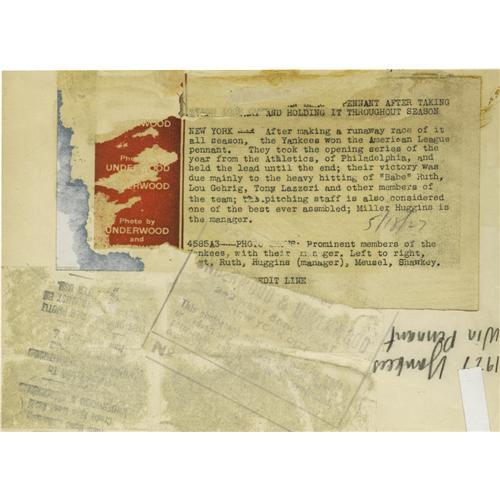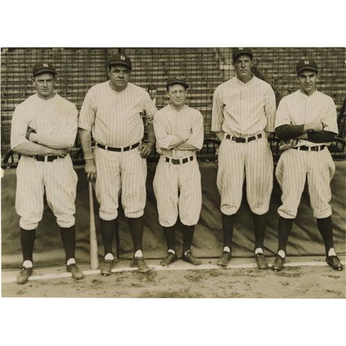 <B>1927 Babe Ruth & Miller Huggins Underwood & Underwood Photograph.</B></I> Magnificent Murderers Row image is the work of the famed Underwood & Underwood Studio, one of the premier news services of the day. Though they should need no introduction, the original paper caption on verso introduces the pinstriped participants of this all-time greatest team as "Hoyt, Ruth, Huggins (manager), Meusel, Shawkey." This flawlessly registered silver-gelatin image is one of the finest we've encountered of the famed 1927 Yankees, and a small horizontal crack in the emulsion spanning the chests of Huggins and Meusel is only visible upon the closest of inspection. Otherwise this 6.5x9" photo presents as NRMT. Type 1.<BR><BR><b>Shipping:</b> Framed - with Glass, Small (<a target="_blank" href="http://www.heritageauctions.com/common/shipping.php">view shipping information</a>)