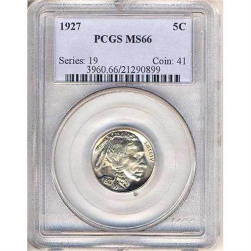 <b>1927 Buffalo Nickel. PCGS graded MS66.</b> Silver-white satin luster is boldly displayed on this fresh-appearing buffalo nickel from the year Lindberg grabbed the world's attention by flying solo across the Atlantic ocean <b>(PCGS # 3960)</b>