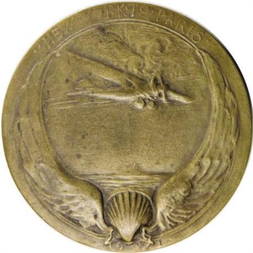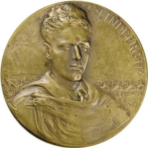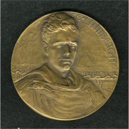 <B>1927 Charles Lindbergh Medal.</B></I> Bronze, 70 mm, 152.4 gm. Struck by Medallic Art Co. of New York. Obverse: facing bust of the youthful aviation hero. Reverse: Lindbergh's plane, "Spirit of St. Louis," over rising sun. Mark-free with only minute distributed carbon.<BR><BR><b>Shipping:</b> Coins & Currency (<a target="_blank" href="http://www.heritageauctions.com/common/shipping.php">view shipping information</a>)