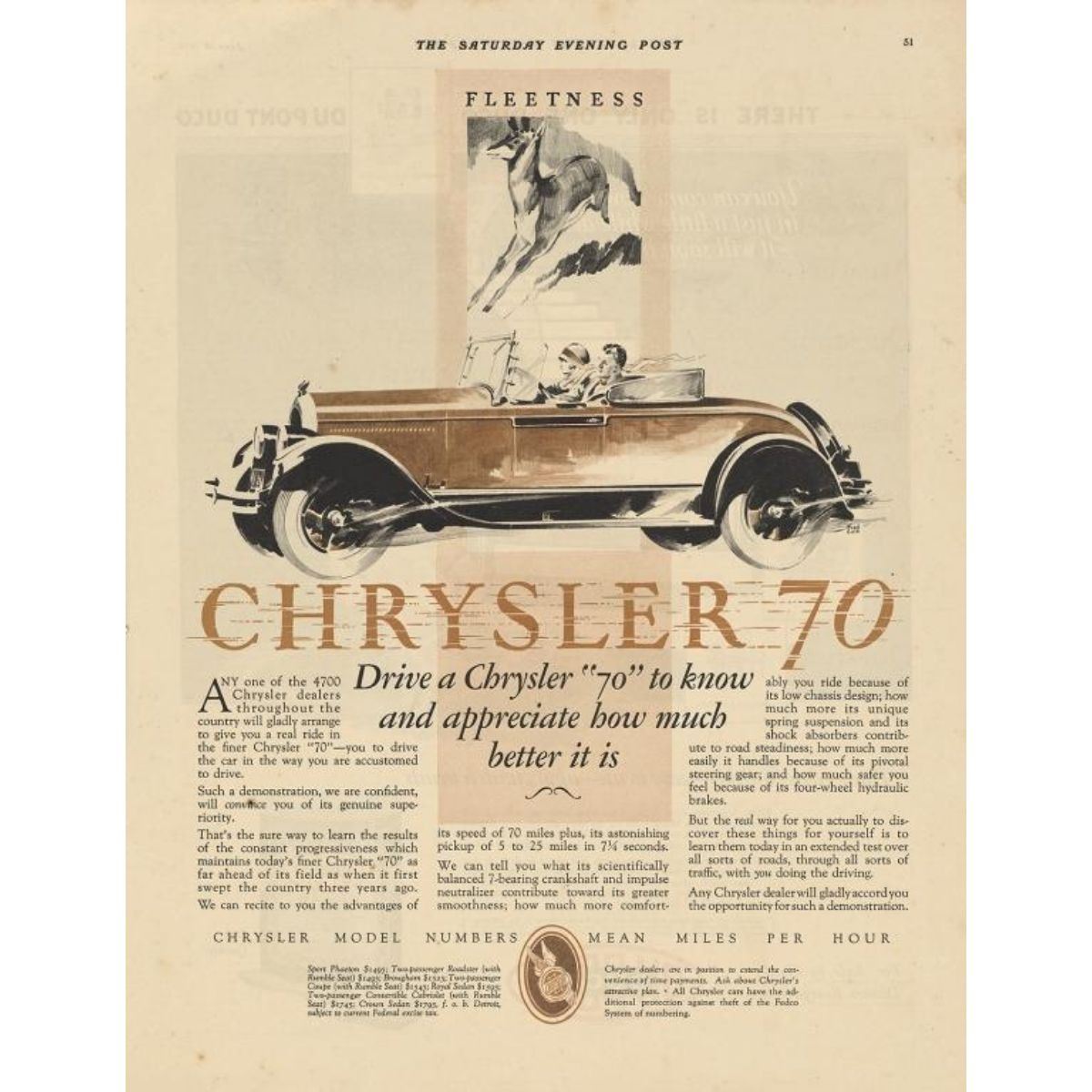 Original magazine advertisement for Chrysler motorcars, the Chrysler 70, from a 1927 edition of The Saturday Evening Post magazine. 10 1/2" X 13 1/2" mounted on archival linen canvas for preservation.