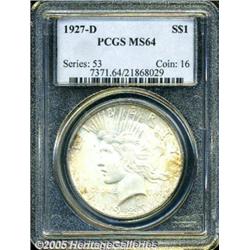 <B>1927-D<img border='0' src='http://www.heritagecoins.com/images/star.gif' width=10 height=10>$1 MS64 PCGS.</B></I> Splotches of olive-green and gold patina visit localized areas of the lustrous surfaces, especially on the obverse. Light marks on Liberty's cheek and on the eagle limit the grade.
