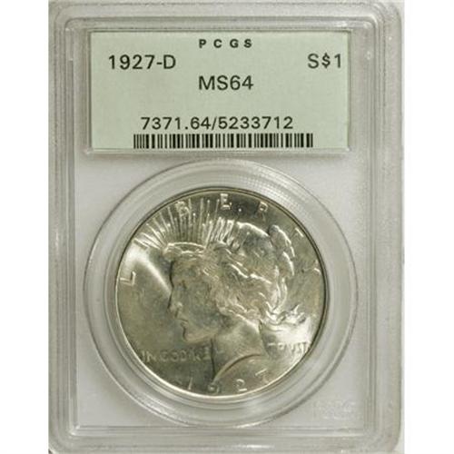 <B>1927-D $1 MS64 PCGS.</B></I> A boldly struck and unmarked near-Gem with pleasing eye appeal for the grade. Medium olive and tan toning intermingles across the lustrous fields. Certified in a green label holder.<BR><BR><b>Shipping:</b> Coins & Currency (<a target="_blank" href="http://www.heritageauctions.com/common/shipping.php">view shipping information</a>)
