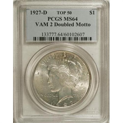 <B>1927-D $1 MS64 PCGS.</B></I> VAM-2. A Top 50 Variety. Notching on the E in WE is the primary evidence for the "Doubled Motto" on this variety. The flashy, frosty surfaces display the wispy diagnostic die crack that extends from below the motto onto the base of Liberty's portrait on the obverse, where dappled milky patina is spread throughout. Modestly marked with only a few grazes. Population: 3 in 64, 2 finer (4/07).<BR><BR><b>Shipping:</b> Coins & Currency (<a target="_blank" href="http://www.heritageauctions.com/common/shipping.php">view shipping information</a>)