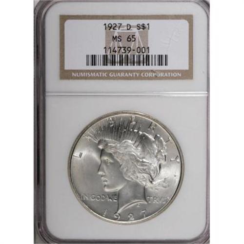 <B>1927-D $1 MS65 NGC.</B></I> This is the rarest Denver Mint Peace dollar in Mint State (David Bowers, 2006). We present here a radiantly lustrous Gem with an impressive strike. It is only the presence of a few minor luster grazes that keeps this marvelous coin from attaining an even higher grade. Census: 81 in 65, 4 finer (3/08).<BR><BR><B>Coin Engraver:</B> Anthony de Francisci<BR><BR><b>Shipping:</b> Coins & Currency (<a target="_blank" href="http://www.heritageauctions.com/common/shipping.php">view shipping information</a>)