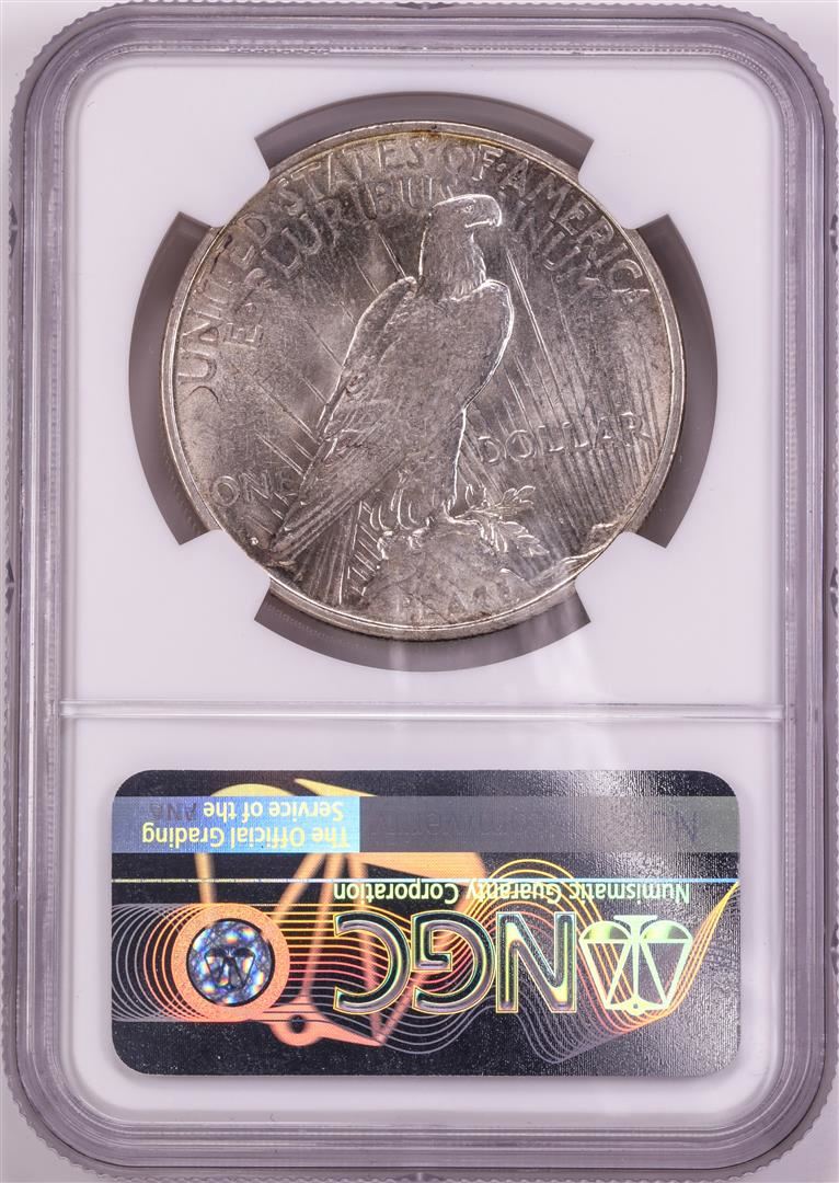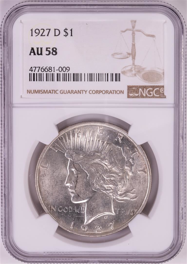 One 1927-D $1 Peace Silver Dollar Coin NGC AU58. NGC Certified.
