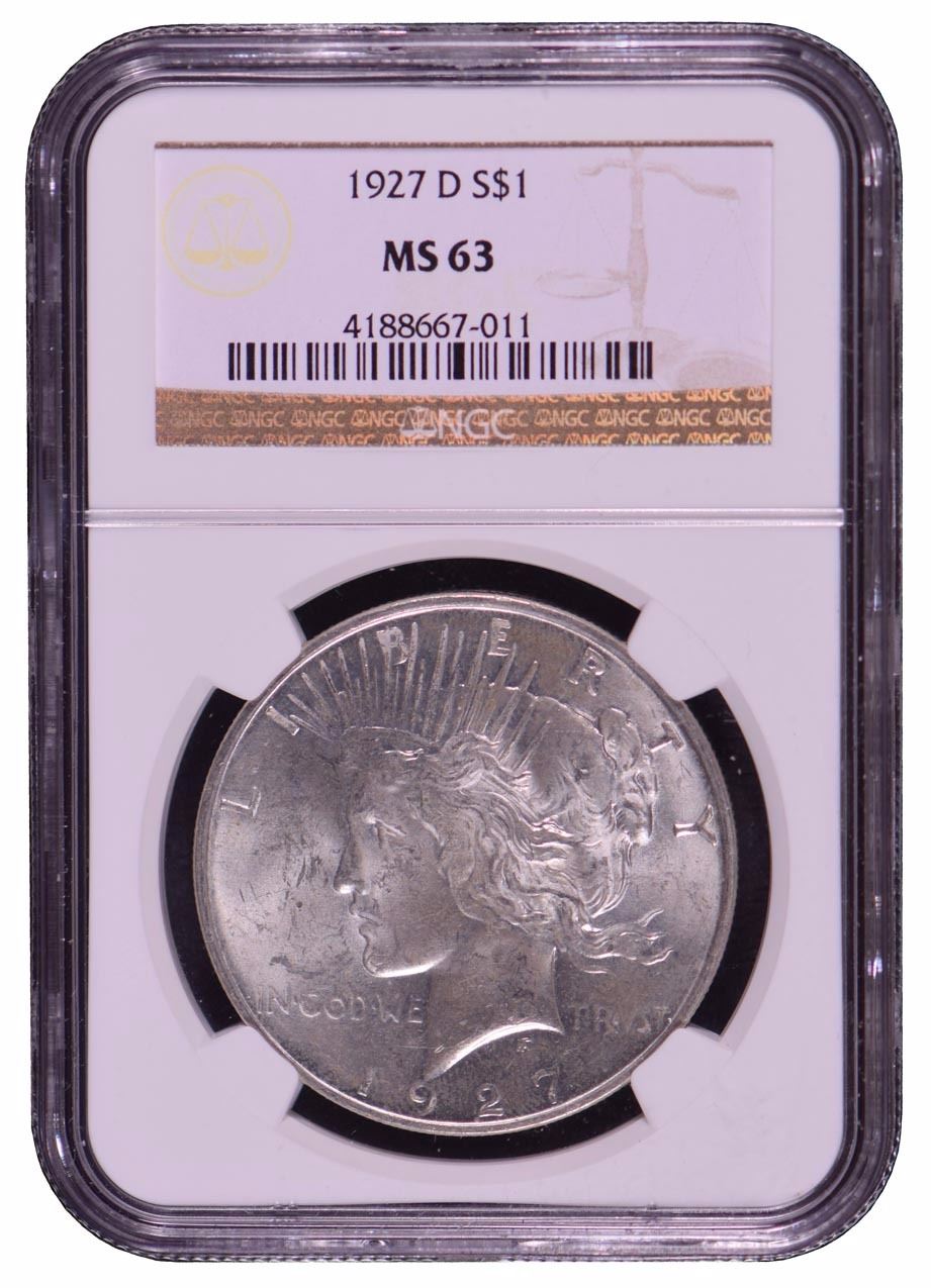 One 1927-D $1 Peace Silver Dollar Coin NGC MS63.