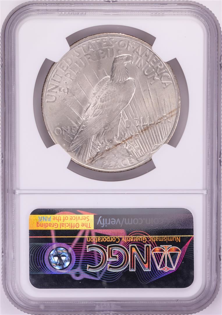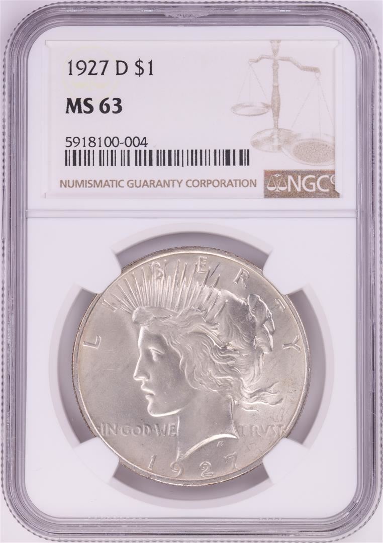 One 1927-D $1 Peace Silver Dollar Coin NGC MS63. NGC Certified.