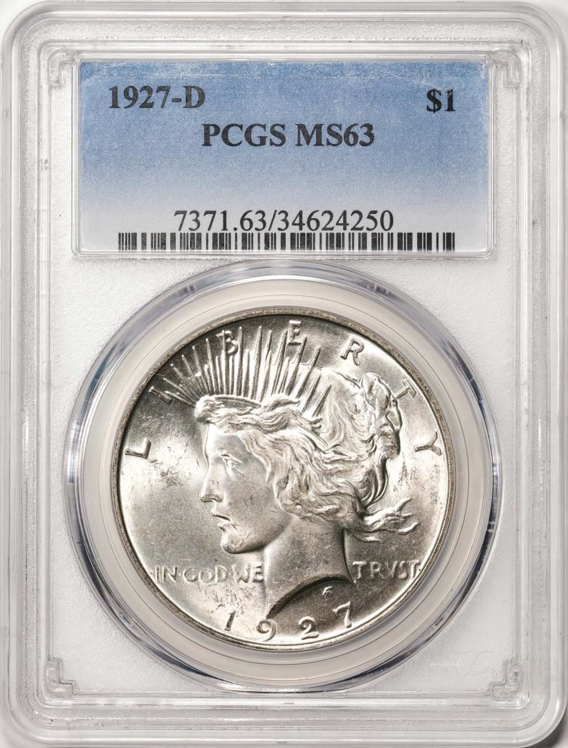 One 1927-D $1 Peace Silver Dollar Coin PCGS MS63. PCGS Graded.