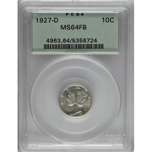 <B>1927-D 10C MS64 Full Bands PCGS.</B></I> Bright silvery surfaces are fully lustrous and show hints of light tan color. All of the design features are well struck, including the date and the mintmark. A few light toning spots are noted on Mercury's cheek, and some minute contact marks occur on the fasces. A very nice looking coin overall. Population: 36 in 64, 33 finer (6/07).<BR><BR><B>Coin Engraver:</B> Adolph A. Weinman<BR><BR><b>Shipping:</b> Coins & Currency (<a target="_blank" href="http://www.heritageauctions.com/common/shipping.php">view shipping information</a>)