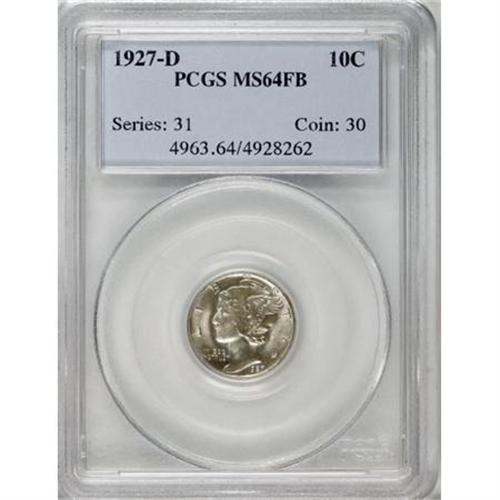 <B>1927-D 10C MS64 Full Bands PCGS.</B></I> Delicate silver-blue and green-gold shadings visit each side of this enticing Choice Full Bands survivor. Powerfully lustrous beneath the thin patina and pleasingly preserved overall. Population: 37 in 64 Full Bands, 34 finer (2/08).<BR><BR><B>Coin Engraver:</B> Adolph A. Weinman<BR><BR><b>Shipping:</b> Coins & Currency (<a target="_blank" href="http://www.heritageauctions.com/common/shipping.php">view shipping information</a>)