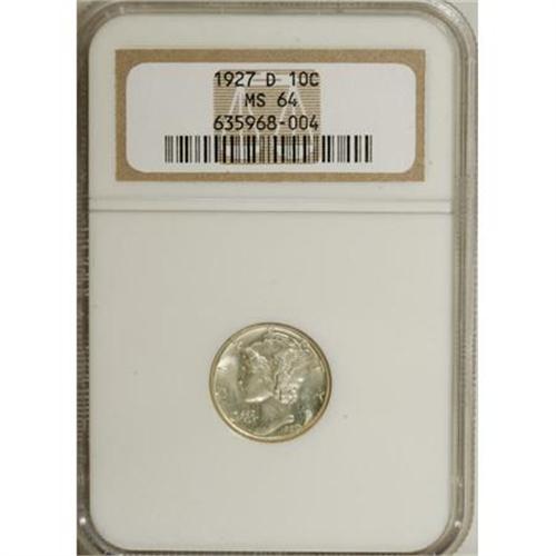 <B>1927-D 10C MS64 NGC.</B></I> NGC Census: (34/25). PCGS Population (40/37). Mintage: 4,812,000. Numismedia Wsl. Price for NGC/PCGS coin in MS64: $408. (#4962)<BR><BR><B>Coin Engraver:</B> Adolph A. Weinman<BR><BR><b>Shipping:</b> Coins & Currency (<a target="_blank" href="http://www.heritageauctions.com/common/shipping.php">view shipping information</a>)