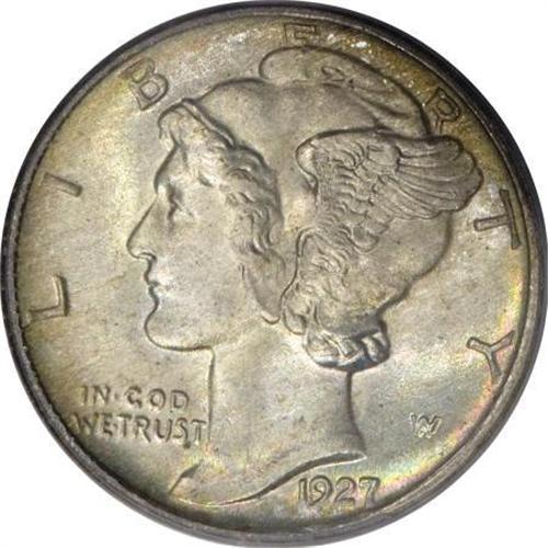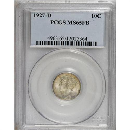 <B>1927-D 10C MS65 Full Bands PCGS.</B></I> The 1927-D Mercury dime is quite scarce in Mint State. The issue is also notorious for its poor overall quality, especially weakness in the peripheries and in the central and diagonal bands (David Lange, 2005). This Gem displays fullness on all of the bands, and much better-than-average definition on the peripheral elements. Highly lustrous surfaces are covered in light gray and rainbow coloration on the obverse, while gray-tan patina on the reverse is sprinkled with russet. A couple of light obverse marks are not worthy of discussion.<BR><BR><B>Coin Engraver:</B> Adolph A. Weinman<BR><BR><b>Shipping:</b> Coins & Currency (<a target="_blank" href="http://www.heritageauctions.com/common/shipping.php">view shipping information</a>)