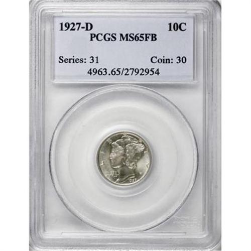<B>1927-D 10C MS65 Full Bands PCGS.</B></I> The 1927-D usually displays flatness on the peripheries and on the central and lower bands. The current Gem is an exception, as these elements are well impressed. Highly lustrous, well preserved surfaces are lightly toned. Population: 24 in 65 Full Bands, 9 finer (12/07).<BR><BR><B>Coin Engraver:</B> Adolph A. Weinman<BR><BR><b>Shipping:</b> Coins & Currency (<a target="_blank" href="http://www.heritageauctions.com/common/shipping.php">view shipping information</a>)