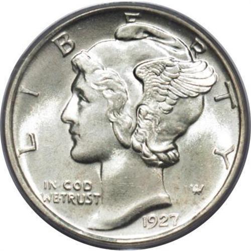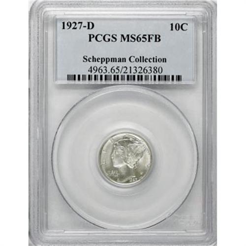 <B>1927-D 10C MS65 Full Bands PCGS.</B></I> The 1927-D is not considered as challenging as certain later issues of the Roaring Twenties, but insistence on Full Bands status levels the playing field for this underrated issue. This satiny piece, silver-blue with subtle tan accents in the reverse fields, offers bold definition and remarkable eye appeal. Population: 24 in 65 Full Bands, 9 finer (12/07).<BR><I>From The Scheppman Collection, #4 PCGS Registry of Full Band Mercury Dimes.</B></I><BR><BR><B>Coin Engraver:</B> Adolph A. Weinman<BR><BR><b>Shipping:</b> Coins & Currency (<a target="_blank" href="http://www.heritageauctions.com/common/shipping.php">view shipping information</a>)