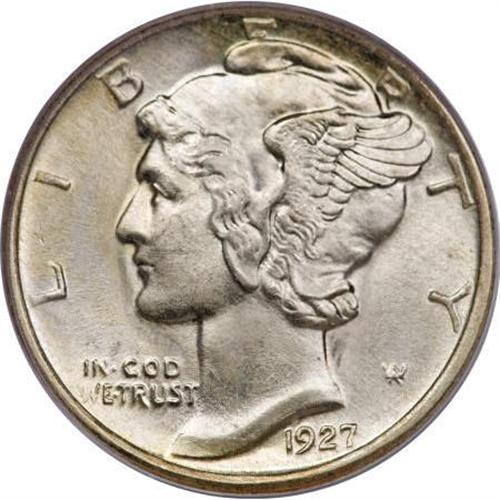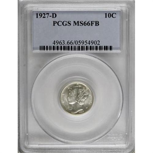 <B>1927-D 10C MS66 Full Bands PCGS.</B></I> One of the series keys with Full Bands and especially in high grade, the 1927-D ranks 12th out of the 77 issues in the Mercury dime series. This issue has see-sawed in value and popularity over the past 60 years. It was originally thought to be a key rarity in 1945. Then, in 1980, Rick Sear reported that the '25-D was actually scarcer in high grade than the '27-D. Since then, this has proven to not be the case and the 1927-D is once again one of the key issues for the Mercury dime collector. <BR> This is a lovely, high-end example that has mostly brilliant surfaces with just a hint of light peripheral color. Remarkably free from abrasions. The reverse fields show evidence of die erosion that gives that side a crinkled, matte-like appearance. Population: 9 in 66, 0 finer (8/07).<BR><BR><B>Coin Engraver:</B> Adolph A. Weinman<BR><BR><b>Shipping:</b> Coins & Currency (<a target="_blank" href="http://www.heritageauctions.com/common/shipping.php">view shipping information</a>)