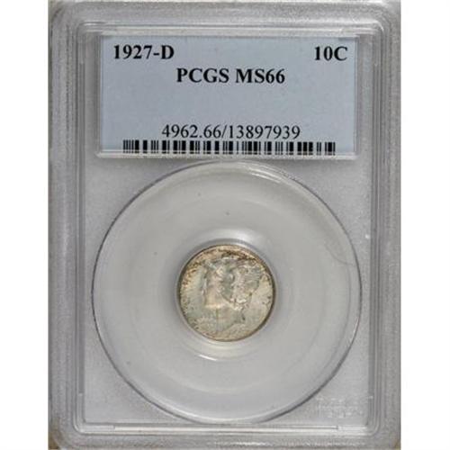 <B>1927-D 10C MS66 PCGS.</B></I> Lustrous surfaces display powder-blue and beige patination, overlaid with speckles of russet. Well struck, including partial separation in the middle bands. Well preserved throughout. Population: 10 in 66, 0 finer (6/07).<BR><BR><b>Shipping:</b> Coins & Currency (<a target="_blank" href="http://www.heritageauctions.com/common/shipping.php">view shipping information</a>)