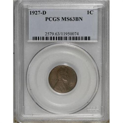 <B>1927-D 1C MS63 Brown PCGS.</B></I> PCGS Population (25/38). NGC Census: (26/43). Mintage: 27,170,000. Numismedia Wsl. Price for NGC/PCGS coin in MS63: $68. (#2579)<BR><BR><B>Coin Engraver:</B> Victor D. Brenner<BR><BR><b>Shipping:</b> Coins & Currency (<a target="_blank" href="http://www.heritageauctions.com/common/shipping.php">view shipping information</a>)