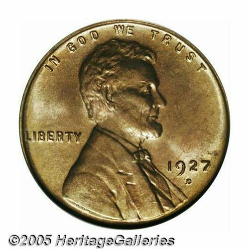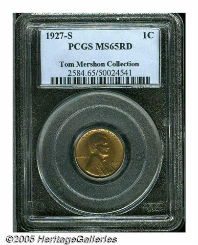 <B>1927-D<1C> MS65 Red PCGS.</B></I> The scarcity of the 1927-D Lincoln is often overshadowed by its even more elusive S-mint counterpart. This solidly graded example is extremely well struck and essentially unmellowed save for tinges of olive patina at the margins. A few shallow blemishes on the portrait are all that separate this lustrous Gem from an even loftier rating. Population: 46 in 65, 2 finer (3/05).<BR><I>From The Tom Mershon #2 All-Time PCGS Registry Set of Lincoln Wheat Cents.</B></I>