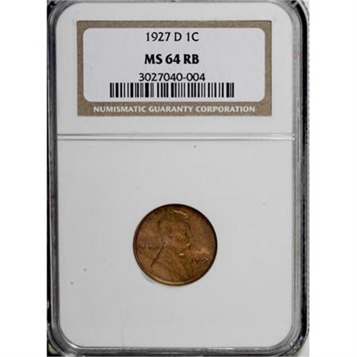 <B>1927-D 1C MS64 Red and Brown NGC.</B></I> NGC Census: (106/49). PCGS Population (176/55). Mintage: 27,170,000. Numismedia Wsl. Price for NGC/PCGS coin in MS64: $150. (#2580)<BR><BR><B>Coin Engraver:</B> Victor D. Brenner<BR><BR><b>Shipping:</b> Coins & Currency (<a target="_blank" href="http://www.heritageauctions.com/common/shipping.php">view shipping information</a>)