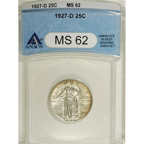 <B>1927-D 25C MS62 ANACS.</B></I> NGC Census: (26/978). PCGS Population (26/807). Mintage: 976,000. Numismedia Wsl. Price for NGC/PCGS coin in MS62: $200. (#5762)<BR><BR><b>Shipping:</b> Coins & Currency (<a target="_blank" href="http://www.heritageauctions.com/common/shipping.php">view shipping information</a>)