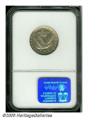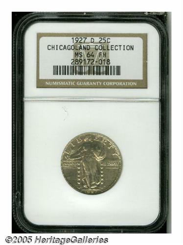 <B>1927-D<25C> MS64 Full Head NGC.</B></I> Ex: Chicagoland Collection. The 1927-D is well known to specialists as one of the poorest produced Quarters from the 1920s. This particular piece is certainly an exception. Only a couple of the lower rivets and the two lowest obverse stars are soft. This full head example has significant underlying brightness with an overlay of reddish-golden patina on each side. Population: 77 in 64, 36 finer (6/05).