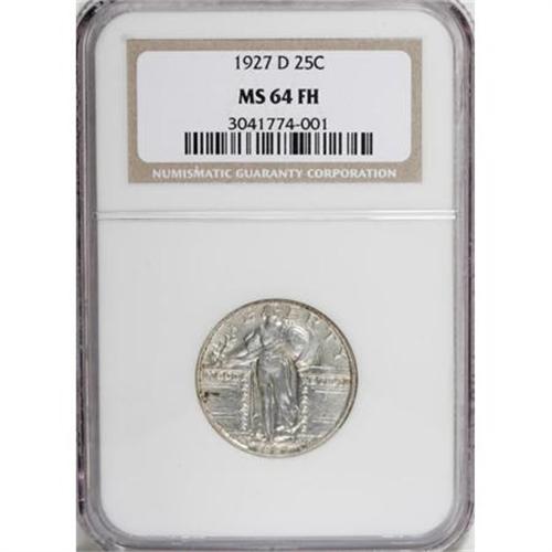 <B>1927-D 25C MS64 Full Head NGC.</B></I> Delicate golden-tan and silver-gray patina with a touch of crimson graces both sides of this Full Head near-Gem. Well-defined overall, though the lower left shield shows a measure of softness. The 1927-D quarter has a mintage of under a million pieces.<BR><BR><B>Coin Engraver:</B> Hermon A. MacNeil<BR><BR><b>Shipping:</b> Coins & Currency (<a target="_blank" href="http://www.heritageauctions.com/common/shipping.php">view shipping information</a>)