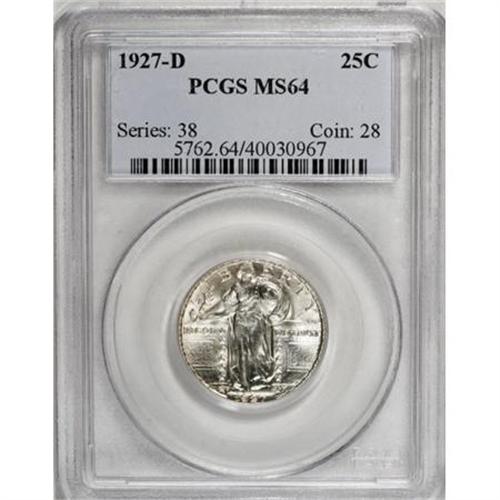 <B>1927-D 25C MS64 PCGS.</B></I> PCGS Population (422/231). NGC Census: (237/186). Mintage: 976,000. Numismedia Wsl. Price for NGC/PCGS coin in MS64: $260. (#5762)<BR><BR><B>Coin Engraver:</B> Hermon A. MacNeil<BR><BR><b>Shipping:</b> Coins & Currency (<a target="_blank" href="http://www.heritageauctions.com/common/shipping.php">view shipping information</a>)