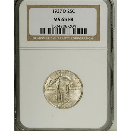 <B>1927-D 25C MS65 Full Head NGC.</B></I> The 1927-D is an issue that is overshadowed by its big brother, the 1927-S, but in Full Head Gem condition it is a difficult coin in its own right. The present specimen is radiant silver-gold, fairly well struck, and showing a couple of small die cracks and many raised die polish lines from die overuse. Population: 64 in 65 Full Head, 13 finer (1/07).<BR><BR><b>Shipping:</b> Coins & Currency (<a target="_blank" href="http://www.heritageauctions.com/common/shipping.php">view shipping information</a>) <BR><BR><B>Important notice:</