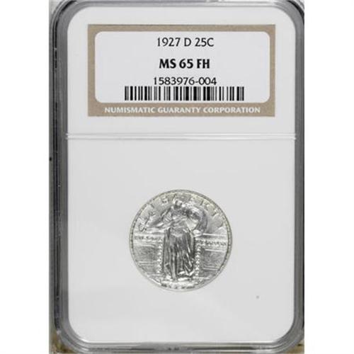 <B>1927-D 25C MS65 Full Head NGC.</B></I> A scarce and underrated coin in the series that is rarely seen with Full Head definition. This piece has bright, blazing mint luster and is completely brilliant. There are no reportable abrasions on either side of this impressive piece. Only 38 Full Head Gems have been certified by NGC with seven finer (1/08). <BR><BR><B>Coin Engraver:</B> Hermon A. MacNeil<BR><BR><b>Shipping:</b> Coins & Currency (<a target="_blank" href="http://www.heritageauctions.com/common/shipping.php">view shipping information</a>)