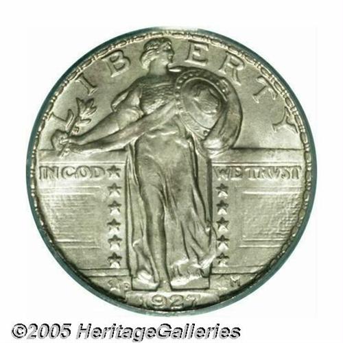 <B>1927-D<25C> MS65 Full Head PCGS.</B></I> Mostly brilliant with an unusually sharp strike and a hint of pastel-peach color on the obverse. Very scarce with the full head designation, this coin could have just come from an original roll. Population: 58 in 65, 12 finer (5/05).