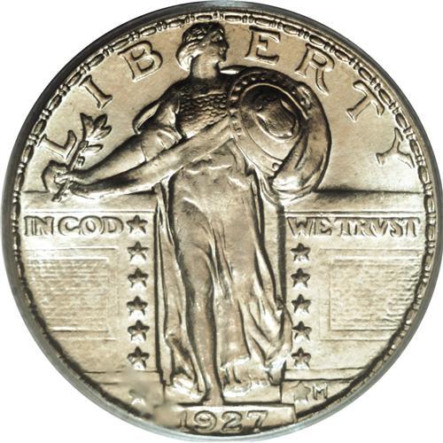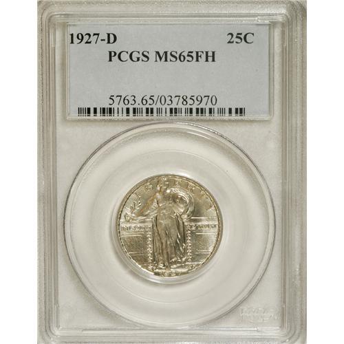 <B>1927-D 25C MS65 Full Head PCGS.</B></I> The problem with the 1927-D is that most pieces show an overall striking weakness, which by definition makes coins with Full Head definition rare. This example has unquestionably full detail on the head of Liberty. As such it is rare and only seldom seen. The surfaces are bright and highly lustrous, as one would expect from a high grade Standing Liberty quarter, and of course, there are no obvious marks. A Gem Full Head example that should be of interest to many of the specialists in this interesting, short-lived series. Population: 65 in 65 Full Head, 13 finer (4/07).<BR><BR><b>Shipping:</b> Coins & Currency (<a target="_blank" href="http://www.heritageauctions.com/common/shipping.php">view shipping information</a>)