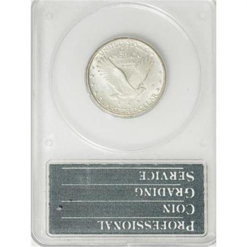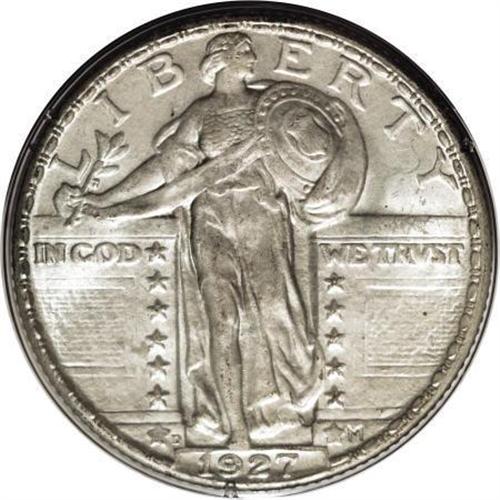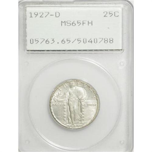 <B>1927-D 25C MS65 Full Head PCGS.</B></I> A particularly attractive coin that retains abundant mint luster and exceptional surfaces for the grade. Sharply impressed throughout, and careful examination fails to reveal any significant abrasions. Milky-white in color save for microscopic flecks of gold on each side. Housed in a first-generation PCGS holder. Population: 68 in 65 Full Head, 13 finer (11/07). <BR><I>From The Hoffy Collection, NGC's #3 Registry Collection of Standing Liberty Quarters.</B></I><BR><BR><B>Coin Engraver:</B> Hermon A. MacNeil<BR><BR><b>Shipping:</b> Coins & Currency (<a target="_blank" href="http://www.heritageauctions.com/common/shipping.php">view shipping information</a>)
