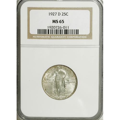 1927-D 25C MS65 NGC. A glowing silver-gray piece that