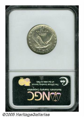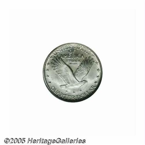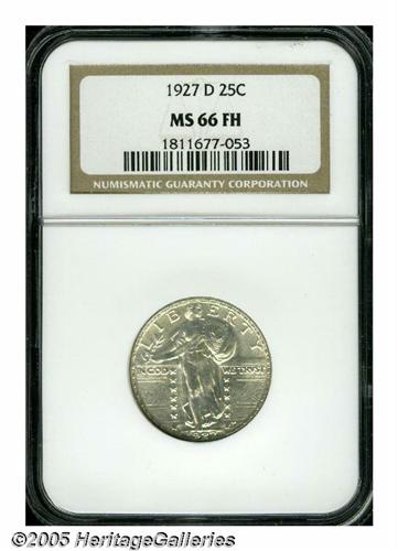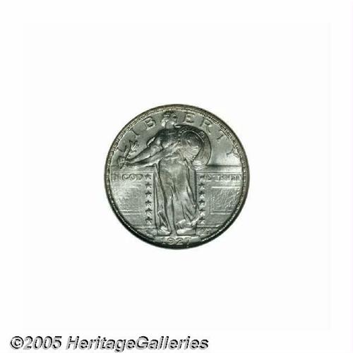 <B>1927-D<25C> MS66 Full Head NGC.</B></I> The '27-D is a strike scarcity that is usually seen with only partial head definition. This specimen is an obvious exception. A couple of the lower rivets and the two lowest obverse stars, however, are a trifle soft. The virtually untoned surfaces exhibit radiant luster and are devoid of significant contact marks. Finer examples are difficult to come by. Population: 4 in 66, 1 finer (6/05).