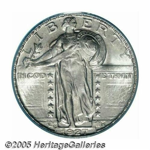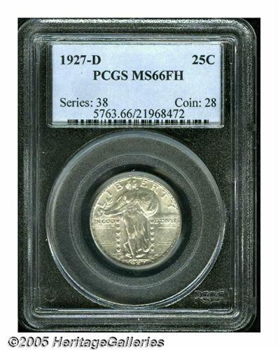 <B>1927-D<25C> MS66 Full Head PCGS.</B></I> One of several Full Head '27-D Quarters in the sale, this example is essentially brilliant and displays a shimmering, well frosted appearance. Only a couple of rivets on Liberty's shield are indistinct, otherwise this Premium Gem boasts excellent sharpness.<BR><I>From The Clifford Columbus Collection.</B></I>
