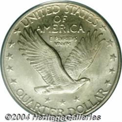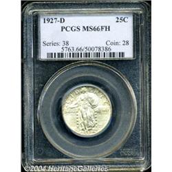 <B>1927-D<25C> MS66 Full Head PCGS.</B></I> Only 976,000 pieces were produced of the 1927-D, and Cline has estimated that only 3% of the coins produced were struck with complete definition on Liberty's head. We see an unusually large number of Full Head examples, but these are almost always lower grades. The surfaces on this piece display soft, frosted mint luster and there is just a bit of golden iridescence on each side. Essentially unblemished and unquestionably original. Population: 10 in 66, 0 finer (3/04). <BR><BR><B>Important notice:</B> Heritage usually auctions material at the rate of 200-250 lots per hour. On some occasions eBay Live bid software or the Internet may not be able to keep up with the pace of the auction. We recommend placing a realistic absentee bid now as insurance to avoid disappointment. Occasionally the auctioneer may eliminate or reject an eBay Live bid, and the auctioneer may also reopen a lot after the close of the eBay live bidding (usually because we missed an audience bid), and may reject your bid even if it shows you as the winning bidder. By bidding via eBay Live, you agree that Heritage may award the lot to another bidder at its sole discretion under the circumstances described above or any other reasonable circumstances. Since eBay bids are not shown to us until we open the lot on the floor, we treat those bids just like floor bids. In most cases the floor responds before the eBay bid is presented to us, due to Internet lag time, so for consistency we have made it a policy that floor bids are always considered first over tie eBay live bids. Also please note that all Heritage lots purchased through eBay Live carry a 20% Buyer's Premium. Please make sure you read the Terms and Conditions before you bid. </span></font></tr></table></td></tr></table>