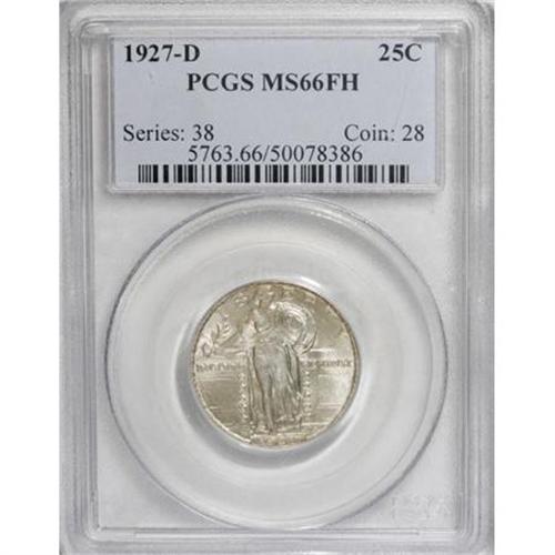 <B>1927-D 25C MS66 Full Head PCGS.</B></I> Only 976,000 pieces were produced of the 1927-D, and full head examples are very scarce, regardless of grade. Premium Gems with complete head definition are decidedly rare. The surfaces on this piece display soft, frosted mint luster and there is just a bit of golden iridescence on each side. The obverse is particularly well preserved. Population: 13 in 66, 0 finer (5/07).<BR><BR><b>Shipping:</b> Coins & Currency (<a target="_blank" href="http://www.heritageauctions.com/common/shipping.php">view shipping information</a>)