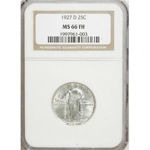 <B>1927-D 25C MS66 Full Head NGC.</B></I> The 1927-D generally comes with a weak strike, and is not readily available with a Full Head. This Premium Gem displays sharp Full Head details, though there are a couple areas of localized softness (the star near the mintmark and the inner shield). Radiantly lustrous white surfaces are well preserved. Census: 5 in 66 Full Head, 2 finer (11/07).<BR><I>From The Hoffy Collection, NGC's #3 Registry Collection of Standing Liberty Quarters.</B></I><BR><BR><B>Coin Engraver:</B> Hermon A. MacNeil<BR><BR><b>Shipping:</b> Coins & Currency (<a target="_blank" href="http://www.heritageauctions.com/common/shipping.php">view shipping information</a>)