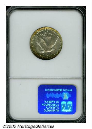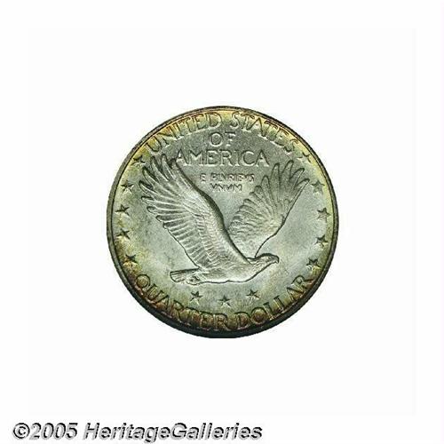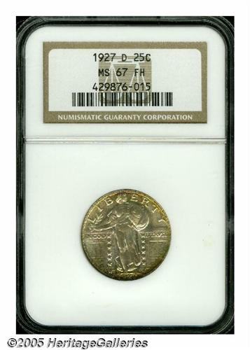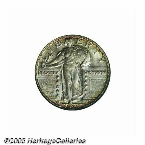 <B>1927-D<25C> MS67 Full Head NGC.</B></I> Gorgeous and intense peripheral toning on this jewel, particularly on the lower obverse and lower reverse which show vibrant greens and fuchsia colors. The centers are generally bright silver, with a tinge of bluish iridescence. Examination of the surfaces will note a few trivial surface nicks, including one in the lower right field. Sharp on Liberty's head and most of the devices, although we note a couple of the shield bosses are weak. If you want a coin with lots of eye appeal, then this is one to pursue. Furthermore, this is the<I> only</B></I> MS67 Full Head graded by either service, and of course, none have been graded higher than the present offering.<BR><I>From The Robert Moreno Collection.</B></I>