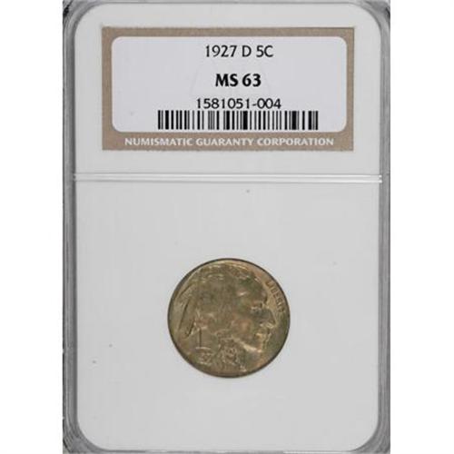 <B>1927-D 5C MS63 NGC.</B></I> NGC Census: (168/215). PCGS Population (284/387). Mintage: 5,730,000. Numismedia Wsl. Price for NGC/PCGS coin in MS63: $240. (#3961)<BR><BR><B>Coin Engraver:</B> James E. Fraser<BR><BR><b>Shipping:</b> Coins & Currency (<a target="_blank" href="http://www.heritageauctions.com/common/shipping.php">view shipping information</a>)