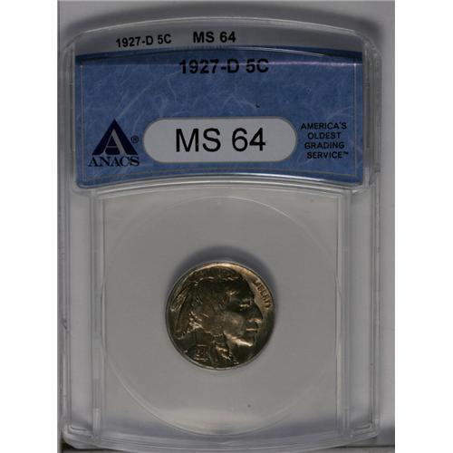 <B>1927-D<5C> MS64 ANACS.</B></I> Warm gold and orange tones enliven the satiny surfaces. The strike shows slight highpoint weakness, like most coins of this issue. A few marks on the Indian's cheek limit the grade.