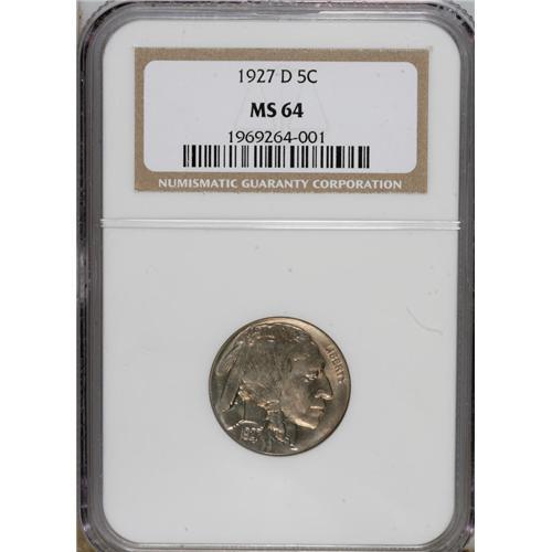 <B>1927-D 5C MS64 NGC.</B></I> Gunmetal-blue and pale gold compete for territory across this lustrous and nearly unabraded near-Gem. Nicely struck for the issue. A minor retained lamination is noted near the top of the Indian's neck.<BR><BR><b>Shipping:</b> Coins & Currency (<a target="_blank" href="http://www.heritageauctions.com/common/shipping.php">view shipping information</a>)