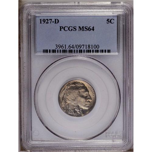 1927-D 5C MS64 PCGS. Somewhat softly struck with satin 1927-D[5C] MS64 PCGS.