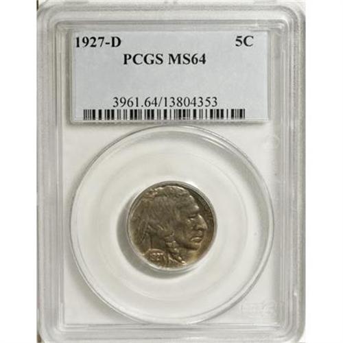 <B>1927-D 5C MS64 PCGS.</B></I> Pink and gold toning graces both sides of this D-mint near-Gem. While the portrait and the bison's shoulder show the softness that appears on the vast majority of examples, the overall eye appeal remains above-average.<BR><BR><B>Coin Engraver:</B> James E. Fraser<BR><BR><b>Shipping:</b> Coins & Currency (<a target="_blank" href="http://www.heritageauctions.com/common/shipping.php">view shipping information</a>)