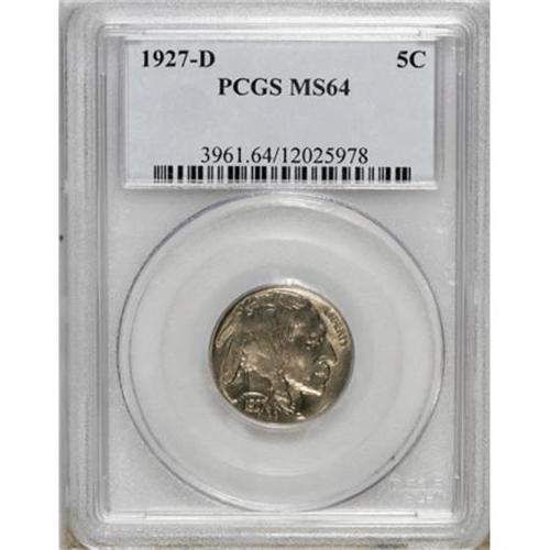 <B>1927-D 5C MS64 PCGS.</B></I> . PCGS Population (357/55). NGC Census: (199/25). Mintage: 5,730,000. Numismedia Wsl. Price for NGC/PCGS coin in MS64: $650. (#3961)<BR><BR><B>Coin Engraver:</B> James E. Fraser<BR><BR><b>Shipping:</b> Coins & Currency (<a target="_blank" href="http://www.heritageauctions.com/common/shipping.php">view shipping information</a>)