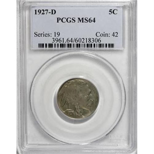 <B>1927-D 5C MS64 PCGS.</B></I> PCGS Population (363/57). NGC Census: (201/25). Mintage: 5,730,000. Numismedia Wsl. Price for NGC/PCGS coin in MS64: $650. (#3961)<BR><BR><B>Coin Engraver:</B> James E. Fraser<BR><BR><b>Shipping:</b> Coins & Currency (<a target="_blank" href="http://www.heritageauctions.com/common/shipping.php">view shipping information</a>)