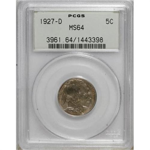 <B>1927-D 5C MS64 PCGS.</B></I> Well struck by the standards of the issue, though the bison's shoulder shows softness. Exotic blue-green, violet, and pumpkin-orange patina drapes each side.<BR><BR><B>Coin Engraver:</B> James E. Fraser<BR><BR><b>Shipping:</b> Coins & Currency (<a target="_blank" href="http://www.heritageauctions.com/common/shipping.php">view shipping information</a>)