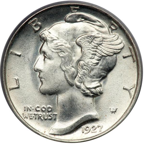 1927-D Mercury Dime. PCGS graded MS-65. A resplendent white coin whose luster gleams all across the surface. Desirable Denver Mint issue. Pop 27; 12 finer in 66 (PCGS # 4962) .