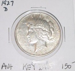 1927-D PEACE SILVER DOLLAR RED BOOK VALUE IS $150.00+ *RARE AU+ HIGH GRADE KEY DATE NICE COIN*!! SILVER DOLLAR CAME OUT OF SAFE!! ***Coin, Currency & All Items Listed in this auction - Grades, Conditions and Values are not Safe Deposit Coins LLC Responsibilty. Grades, Condition and Values are determined by Consigner(s) & Buyers ONLY