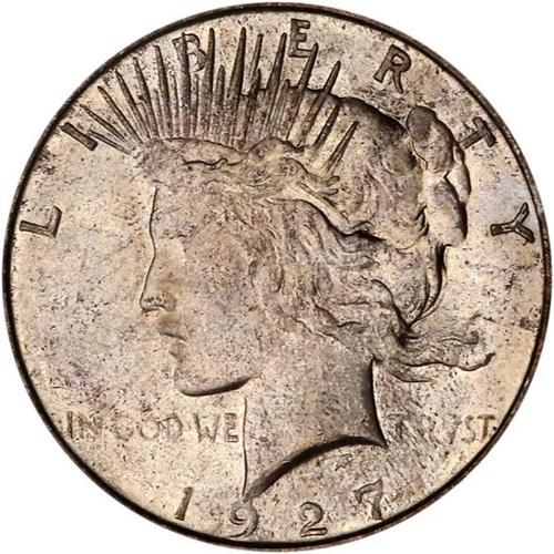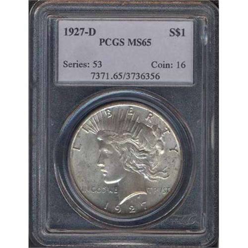 <b>1927-D Peace Dollar. PCGS graded MS65.</b> Luminous white surfaces underneath pale milky gray toning. There is no deviation in the sharp relief seen of this well struck 1927-D dollar, not even in the centers of the coin. This D-mint issue has the largest mintage of the three 1927-dated Peace dollar deliveries, but the production of 1.2 million pieces is still fairly small by early 20th century standards. Although higher circulated and lesser quality Mint State coins are available without difficulty, Gems are of the utmost scarcity. A gem! <b>(PCGS # 7371)</b>